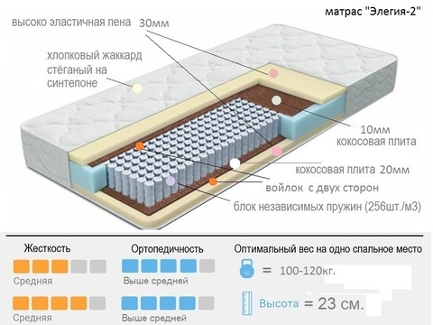 Матрас на основе блока независимых пружин, который легко адаптируется к формам Вашего тела. Сжатие каждой отдельной пружины в блоке происходит независимо от соседних пружин, поэтому отсутствует эффект «волны».В качестве мягкого наполнителя используется материал - " высоко-эластичная пена " не имеющая аналогов среди материалов, применяемых в мебельной промышленности. Особенность этого материала: появляется эффект наподобие невесомости, полное ощущение комфорта и отсутствие каких-либо проблем с недостатком кровоснабжения сосудов, которые ничто не сдавливает. На матрасе с наполнителем " высоко-эластичная пена "- можно проспать всю ночь, ни разу не перевернувшись на другой бок. Матрас средней жёсткости. Высота матраса 23 см. Максимальный вес на спальное место 100-130кг.