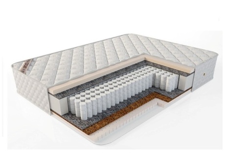 Основа матраса - блок независимых пружин "мультипакет". Изолирующая прослойка из термовойлока исключает соприкосновение пружинного блока с другими наполнителями. В матрасе применена плита уникального материала с эффектом памяти «Мемориформ, который обладает свойством принимать точную форму тела, снимать мышечное напряжение, что благоприятно сказывается на кровообращении, а так же с одной стороны применина плита кокосовой койры, который обеспечивает умеренную жёсткость, оптимальный ортопедический эффект, надежную поддержку позвоночника. В качестве обивочного материала используется светлый хлопковый жаккард, простёганный на холофайбере. Матрас двусторонней жёсткости. Высота матраса 22 см. Максимальный вес на спальное место 120 кг.