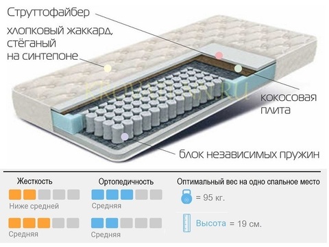 Жесткость: 1 сторона - средняя;(100-110кг) 2 сторона -ниже средней;(80-90кг) Высота: 19 см.